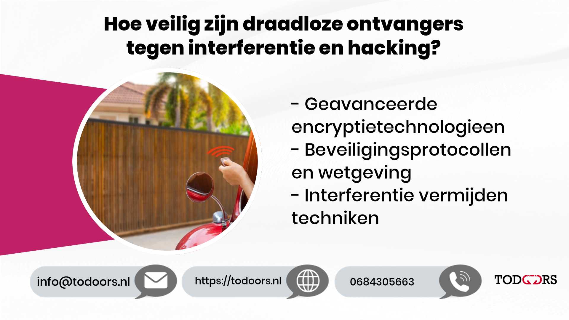 Net als bij andere elektronische apparaten, zijn er ook internationale standaarden en regelgeving waaraan draadloze ontvangers moeten voldoen. Dit zorgt ervoor dat alle apparaten op een veilige en compatibele manier werken. Dit is vooral belangrijk voor gebruik in commerciële toepassingen, zoals automatische deuren. Interessante informatie over automatische deuren vind je hier.