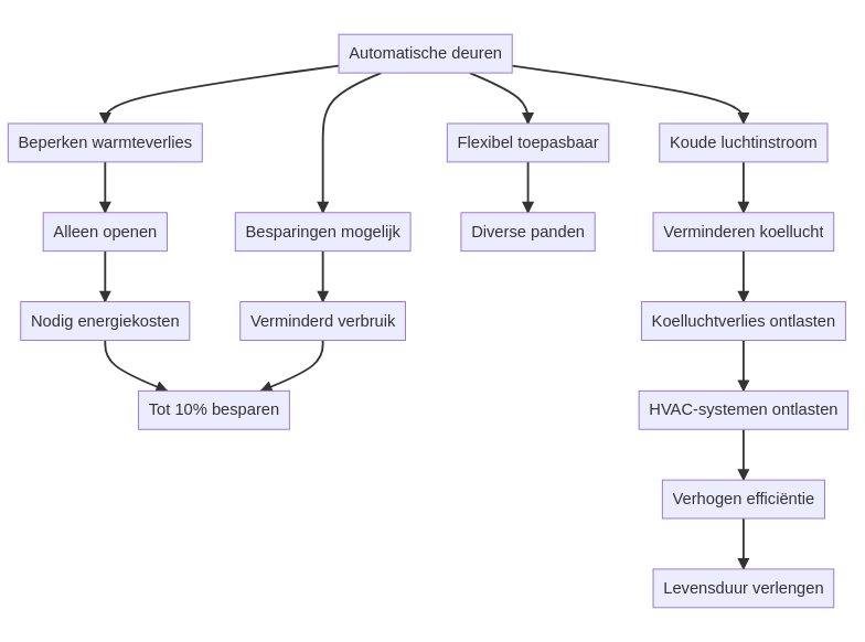 Wist je dat automatische deuren de belasting op je HVAC-systemen kunnen verminderen? Door minder warmteverlies en minder airconditioningverlies, hoeven je verwarmings- en koelingssystemen minder hard te werken. Dit verhoogt de efficiëntie van het gehele systeem, wat weer leidt tot een langere levensduur en minder onderhoudskosten.