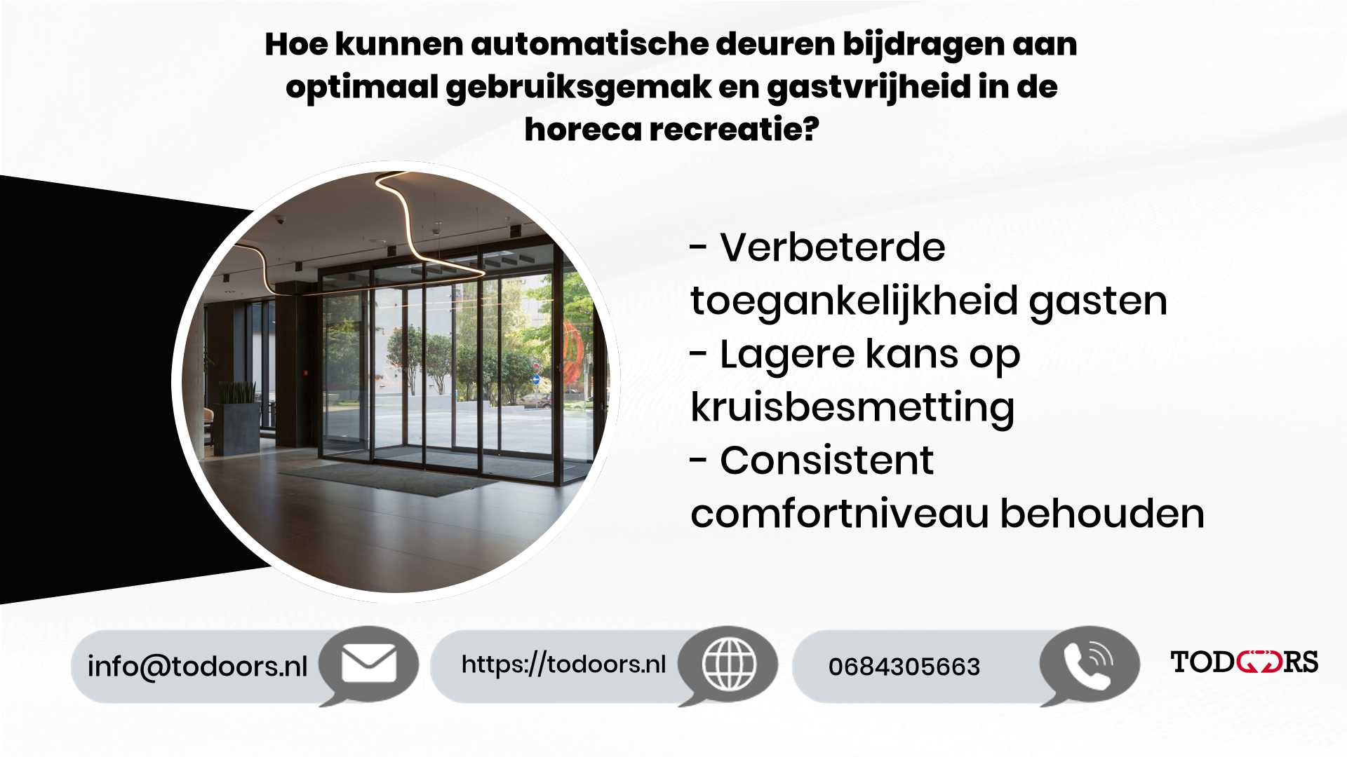 Automatische deuren zijn een meerwaarde voor jouw horecaonderneming. Ze verbeteren niet alleen het gebruiksgemak, maar dragen ook bij aan een gastvrijere en hygiënische omgeving. Door deze eenvoudige aanpassing te maken, geef je jouw gasten de ervaring die ze verdienen.