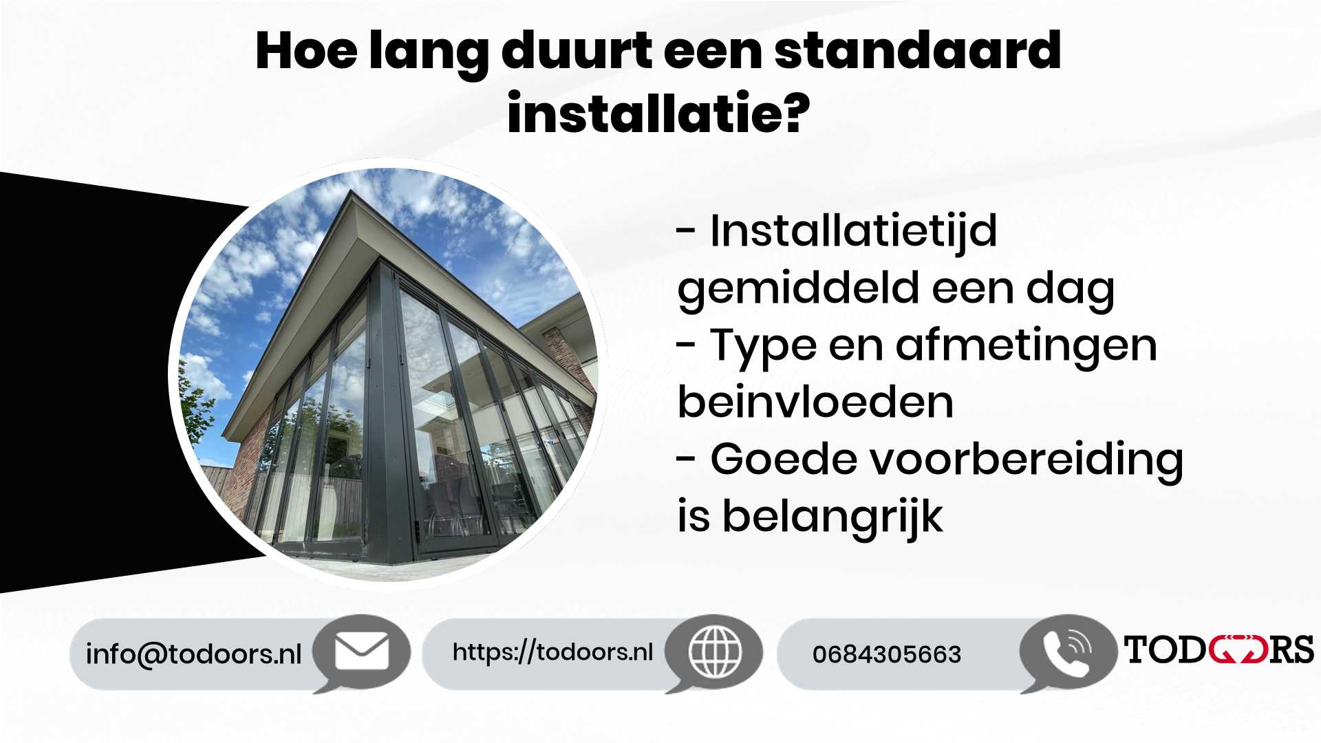 - Type deur: Een eenvoudige binnendeur zal meestal sneller geïnstalleerd zijn dan een complexere automatische deur.