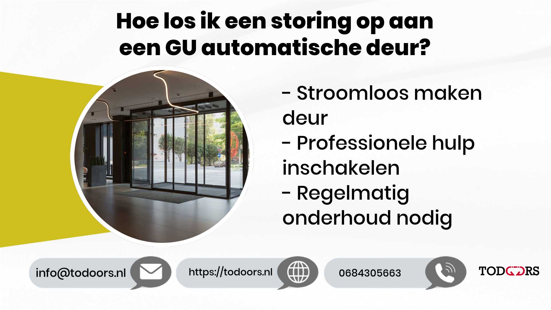 Als het herstarten van je GU deur niet het gewenste resultaat oplevert, is het misschien tijd om professionele hulp in te schakelen. Soms kunnen storingen te maken hebben met ingewikkeldere problemen die je zelf misschien niet kunt oplossen. Neem in dat geval contact met ons op! Wij zijn er om je te helpen bij al je vragen over automatische deuren. Geen twijfel over mogelijk dat we de juiste oplossing hebben voor jouw specifieke situatie.