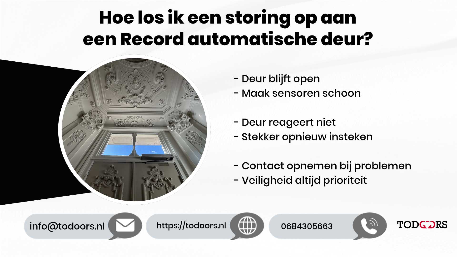 Samen kunnen we de problemen bij je Record automatische deur oplossen. Of je nu met een gebruiksprobleem of een storing te maken hebt, er zijn altijd manieren om dingen weer op de rails te krijgen. Aarzel niet om je vragen aan ons te stellen. Neem contact met ons op en we helpen je verder!