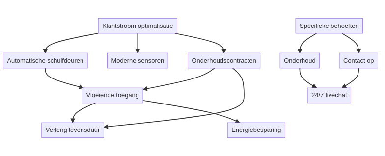 Sensoren spelen een cruciale rol bij het versnellen van de klantbeweging. Moderne sensoren reageren snel, wat helpt om de deur alleen te openen wanneer dat nodig is. Dit verhoogt niet alleen de efficiëntie, maar is ook veiliger. Lees meer over de regelgeving rondom sensoren.