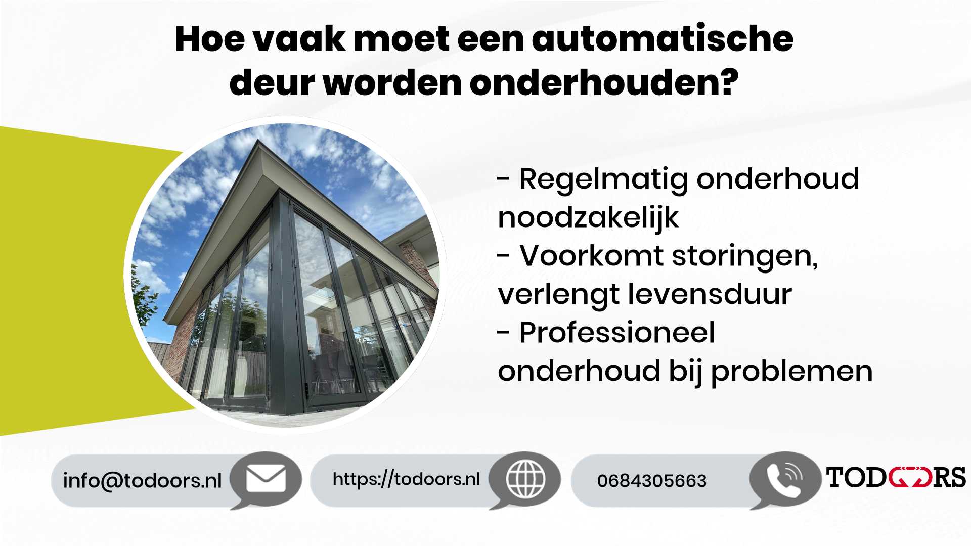 Dus, om te beantwoorden: onderhoud je automatische deur minimaal één keer per jaar en bij intensief gebruik zelfs twee keer per jaar. Het kost misschien wat tijd en geld, maar het is een investering die zich op lange termijn terugbetaalt. Neem contact met ons op voor meer informatie over het onderhoud van automatische deuren. Je kunt ons bereiken via onze Live chat 24/7.