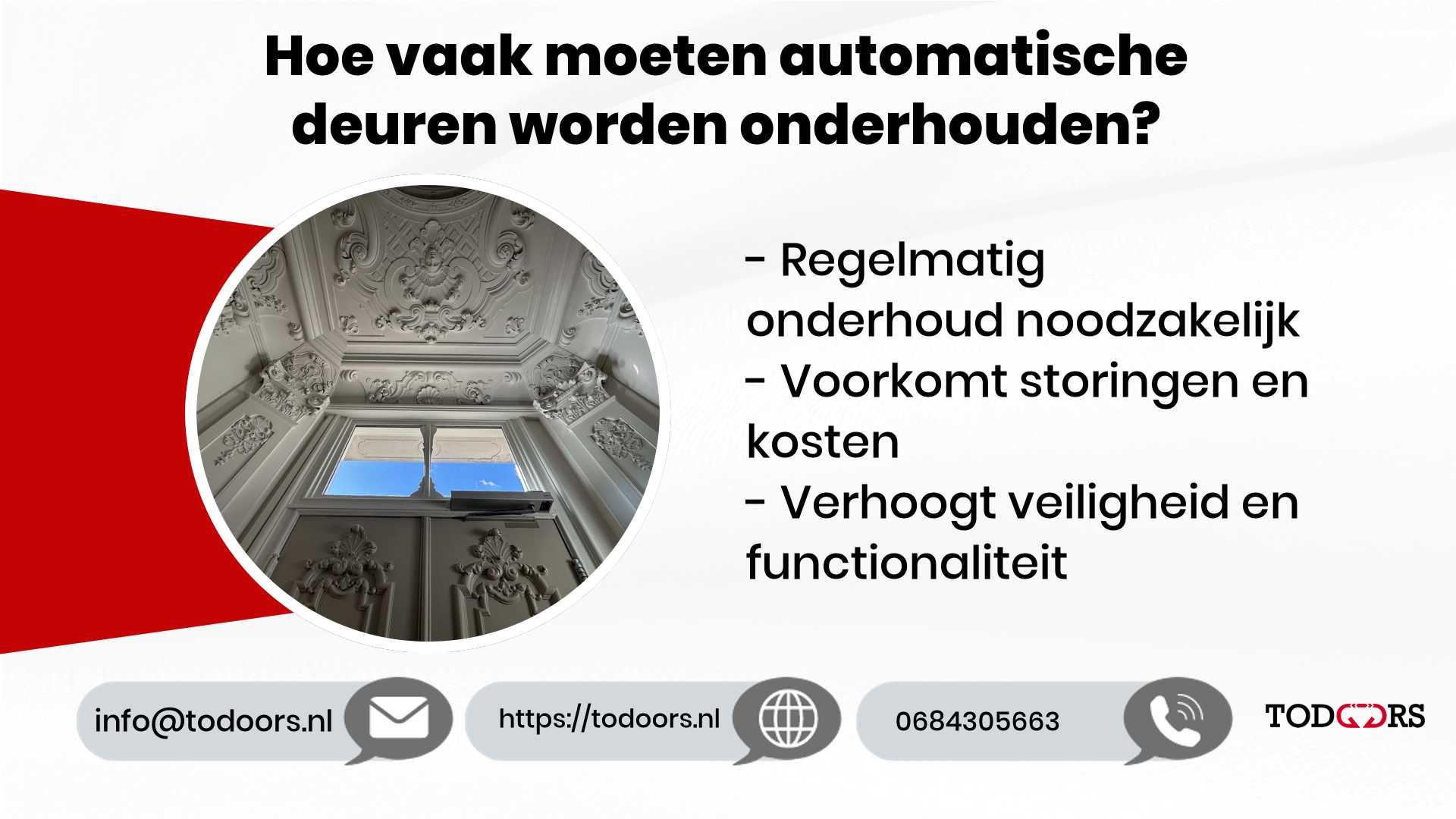 Bij onderhoud aan automatische deuren wordt vaak aangeraden dit te plannen tussen elke 6 en 12 maanden. Dit verschilt echter per gebruik. Heb je een deur die dag in, dag uit open en dicht gaat? Dan is het cruciaal om misschien zelfs elk kwartaal een inspectie te plannen. Wil je meer weten over de voordelen van automatische deuren voor gebouwen? Kijk dan eens op deze link.