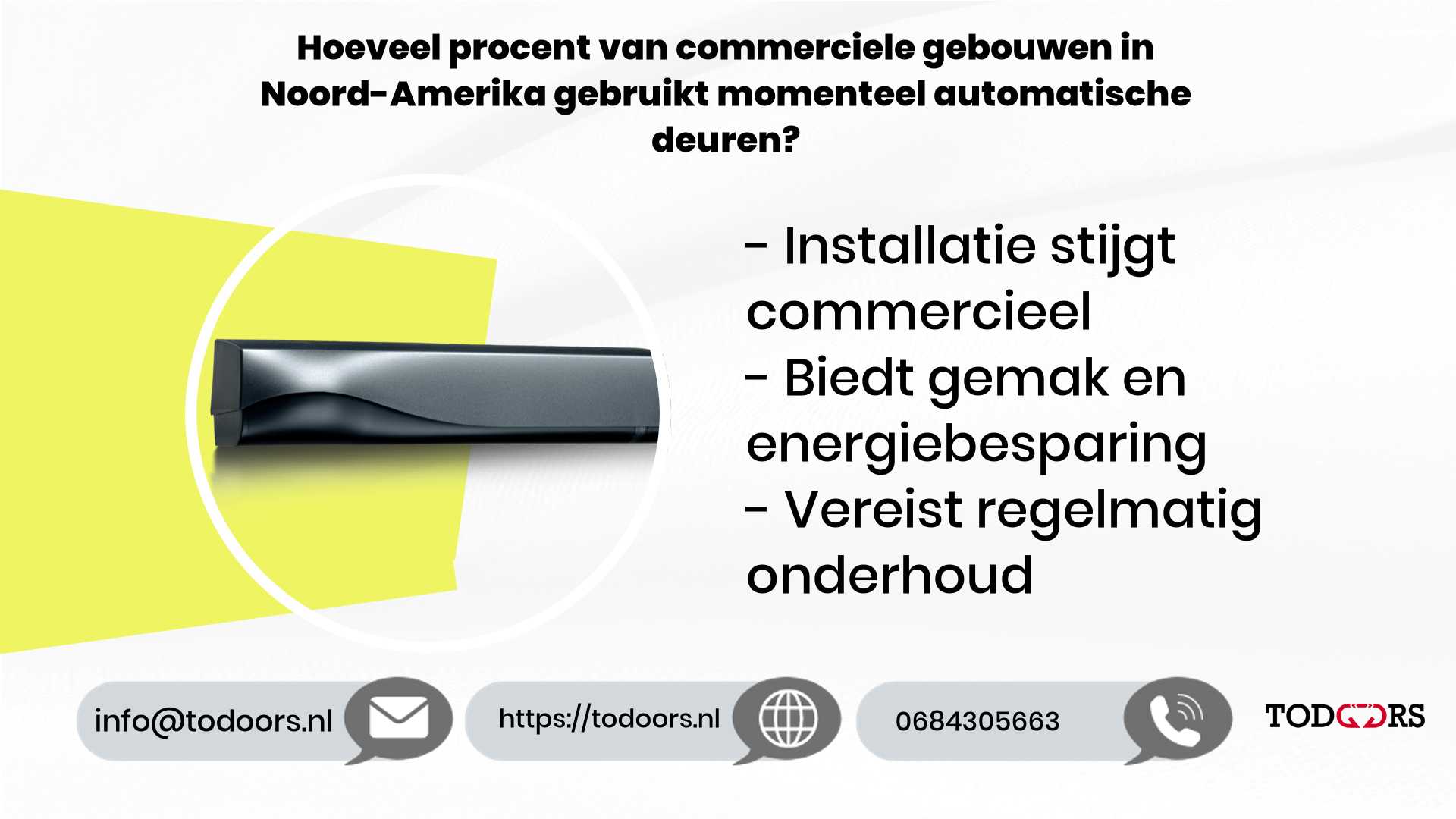 Met de verwachte stijging naar 75% in 2026, zullen we ongetwijfeld meer innovaties en verbeteringen zien in de wereld van automatische deuren. Deze deuren zullen waarschijnlijk nog efficiënter, veiliger en gebruiksvriendelijker worden met de tijd.