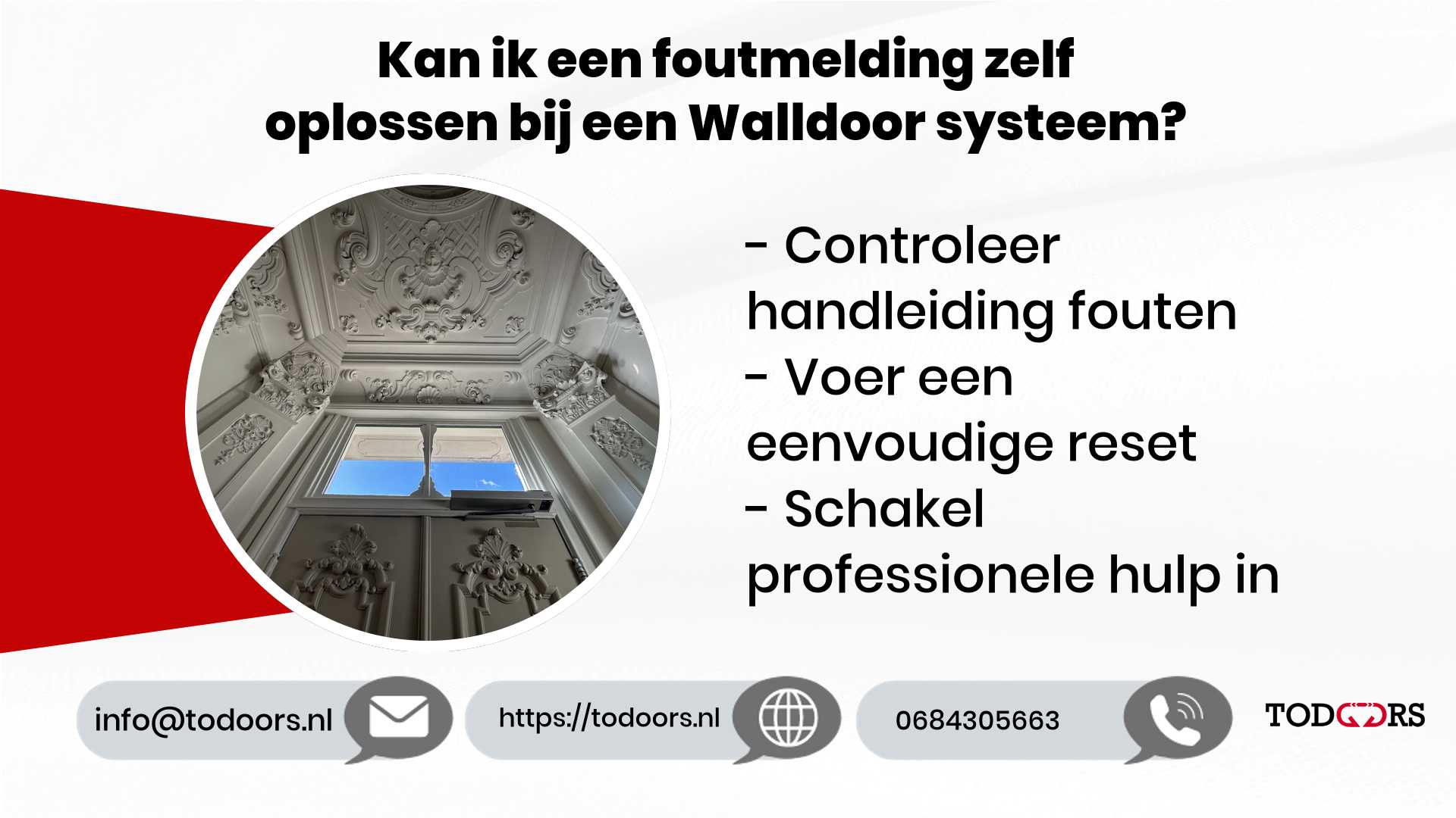Kortom, het zelf oplossen van een foutmelding bij een Walldoor systeem is zeker mogelijk voor eenvoudige problemen. Raadpleeg je handleiding en probeer een reset. Ben je er niet uit? Schroom dan niet om professionele hulp in te schakelen. Wij staan altijd voor je klaar!