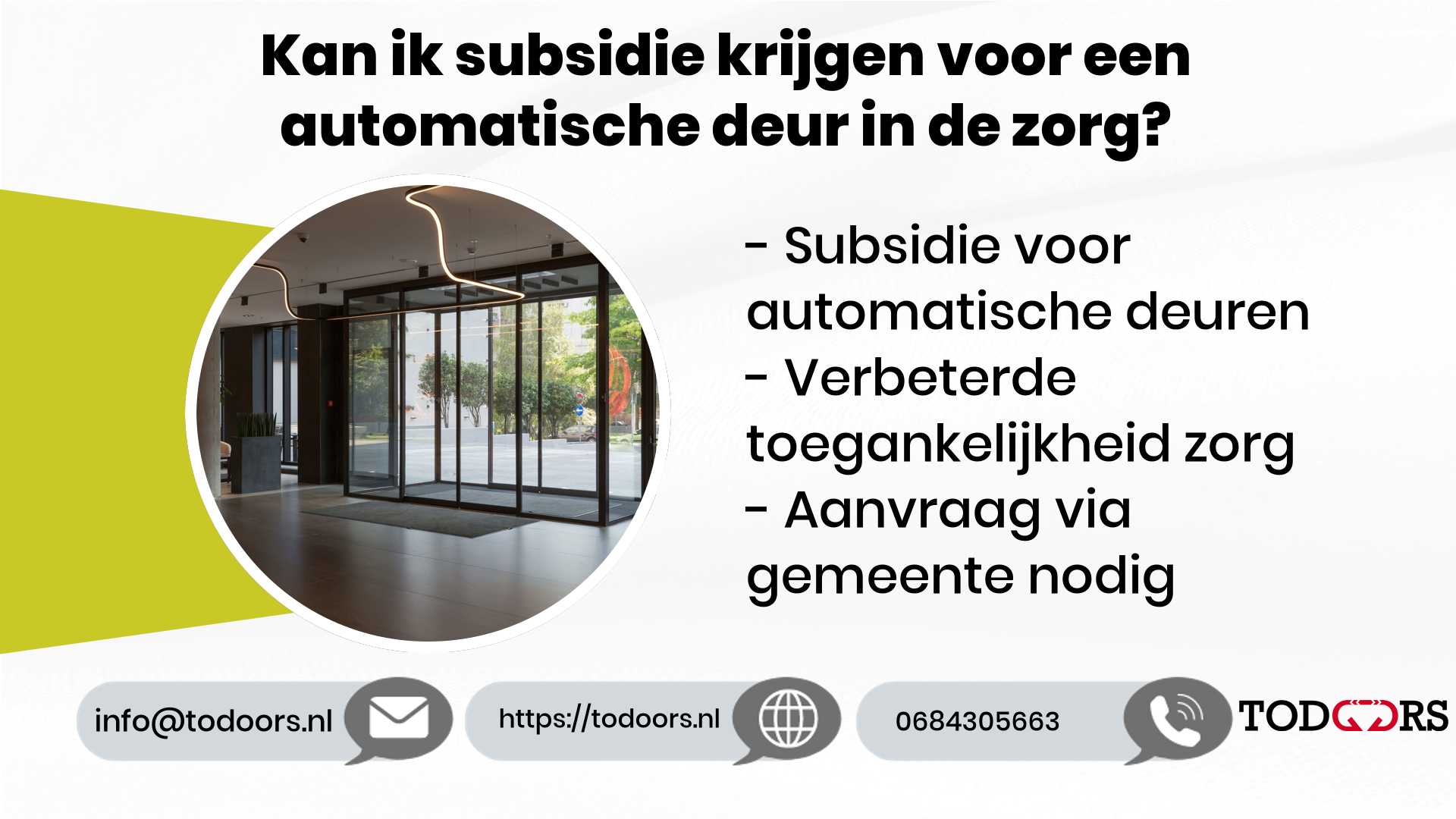 In de zorgsector wordt de toegankelijkheid steeds belangrijker. Het installeren van een automatische deur kan de toegang voor patiënten en personeel vergemakkelijken. Maar heb je je ooit afgevraagd of je hiervoor subsidies kunt aanvragen? Het antwoord is: in sommige gevallen wel! Wij helpen graag met de documentatie voor Wmo of zorgsubsidieaanvragen.