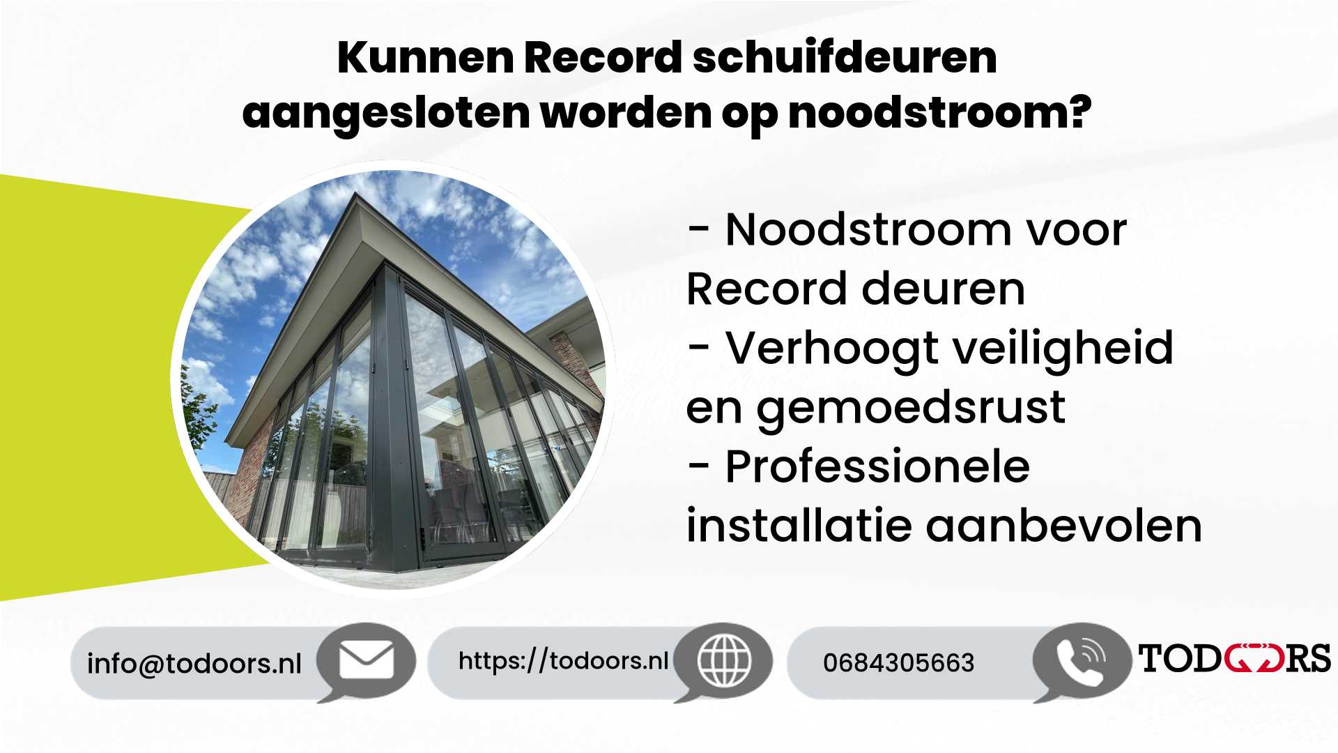 Conclusie: Geen enkele gebouwbeheerder wil zich zorgen maken over een plotselinge stroomuitval. Met de mogelijkheid om je Record schuifdeuren aan te sluiten op noodstroom, ben je goed voorbereid. Dit verhoogt de gebruiksvriendelijkheid en veiligheid van je ruimte.’,