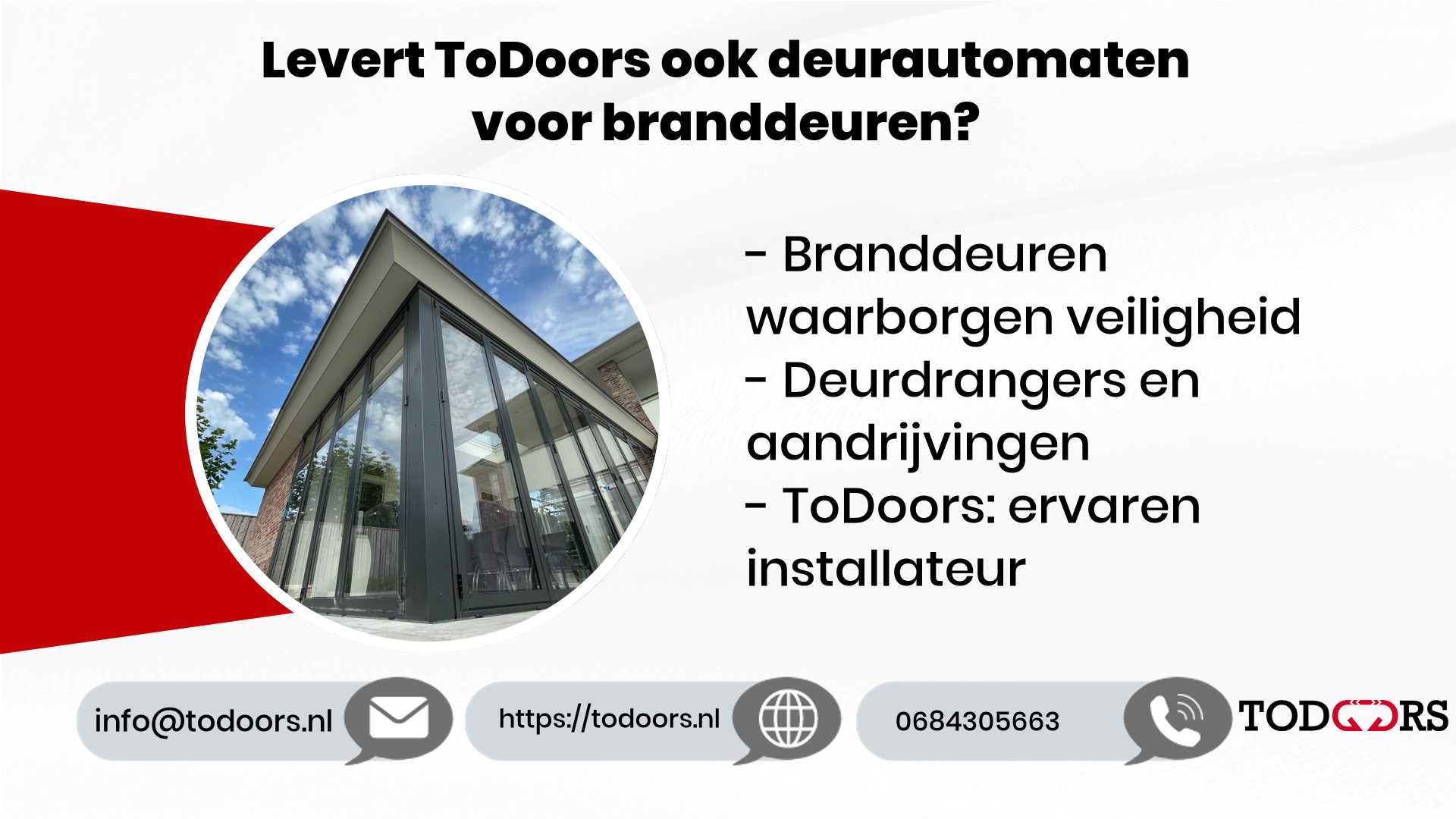 Bij ToDoors hebben we jarenlange ervaring met het leveren en installeren van allerlei soorten deurautomatiseringen, inclusief voor branddeuren. We begrijpen dat elke situatie uniek is, en we zijn hier om je te helpen bij het vinden van de juiste oplossing voor jouw gebouw. Bekijk ook onze andere producten en voordelen, zoals zonwering, die bijdragen aan de gezondheid en het comfort van je ruimte.