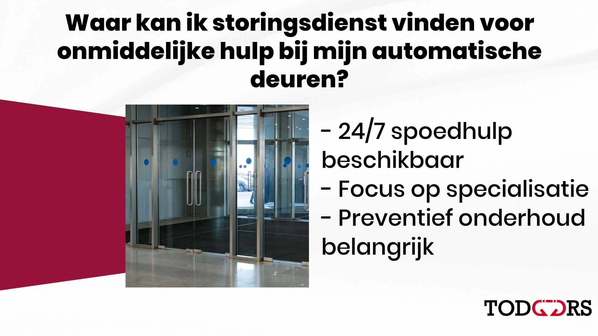Automatische deuren zijn essentieel voor het dagelijkse gebruik van vele gebouwen en faciliteiten. Een onverwachte storing kan een grote impact hebben. Gelukkig zijn er storingsdiensten die 24/7 klaarstaan om jouw problemen snel te verhelpen en tevens diensten voor preventief onderhoud aanbieden.