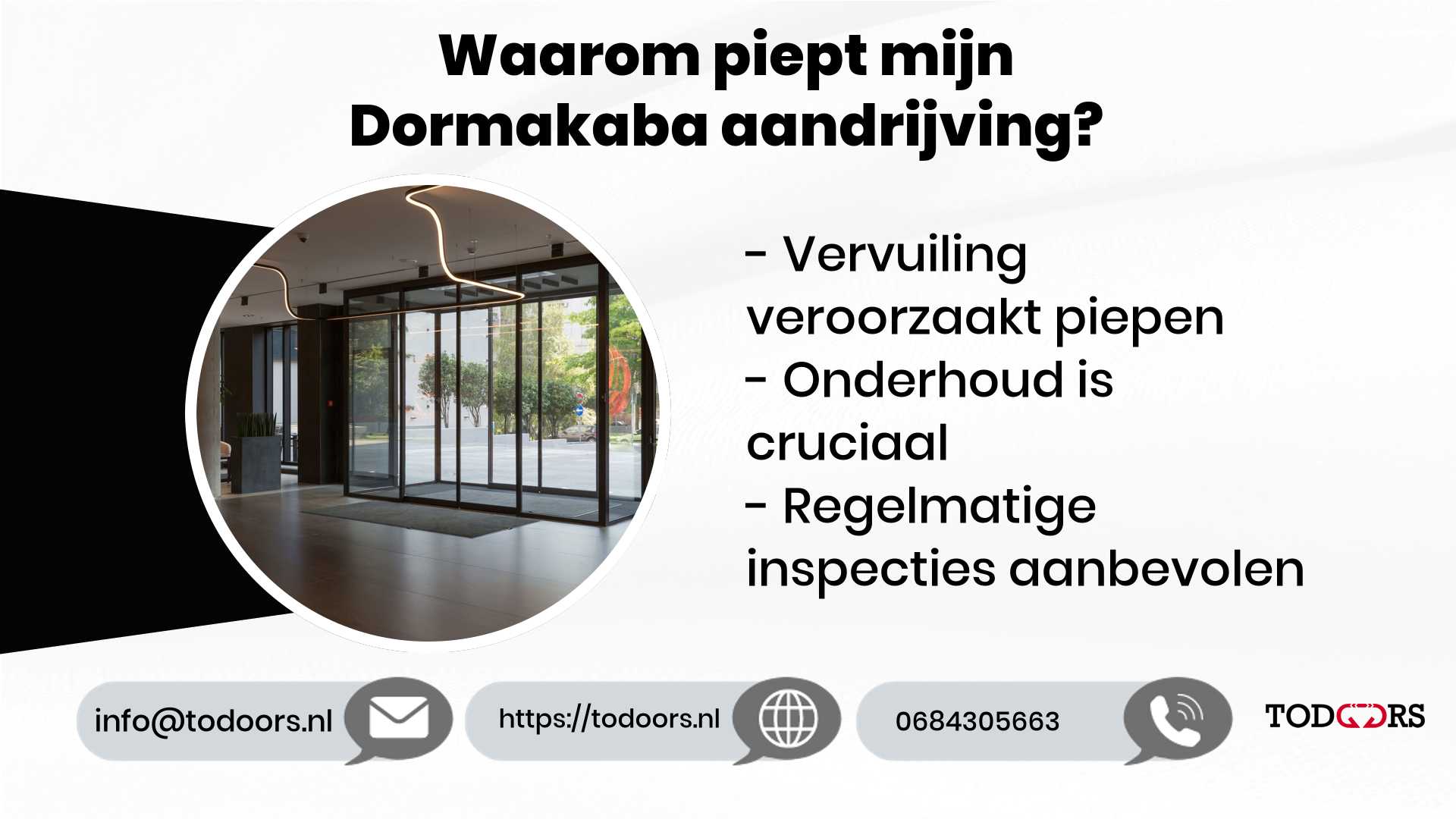 Heb je onlangs gemerkt dat je Dormakaba aandrijving piept als hij opent of sluit? Geen paniek, je bent zeker niet de enige. Er kunnen verschillende redenen zijn waarom je automatische deur zulke geluiden maakt. Het is belangrijk om stil te staan bij deze klachten, want wie wil er nou dat zijn deur als een oude kraan klinkt, toch?