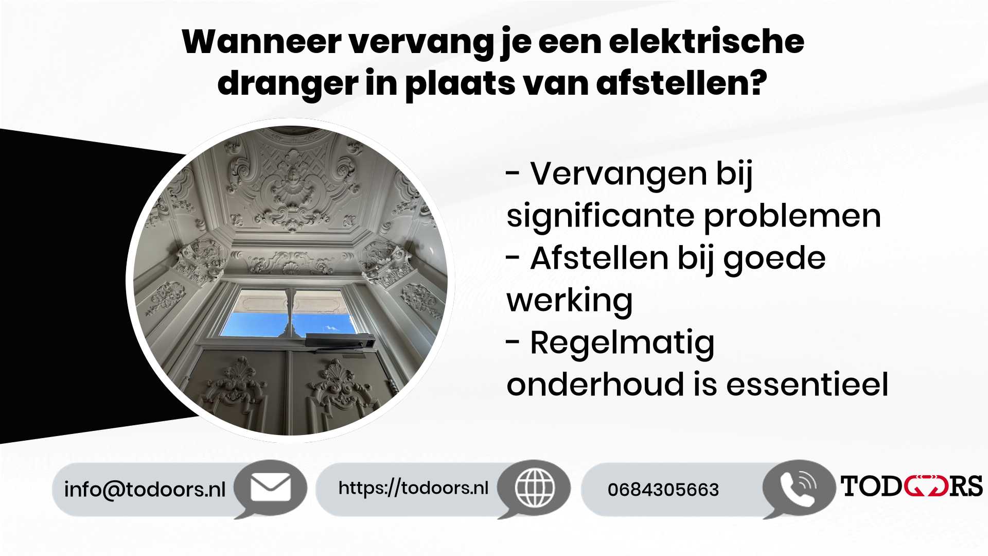 Uiteindelijk is het bij elektrische drangers belangrijk om te kijken naar de specifieke situatie en eventuele signalen serieus te nemen. Voorkom onnodige kosten door regelmatig onderhoud uit te voeren en maak een weloverwogen keuze tussen afstellen of vervangingen. Heb je twijfels? Neem gerust contact met ons op via Live chat 24/7!