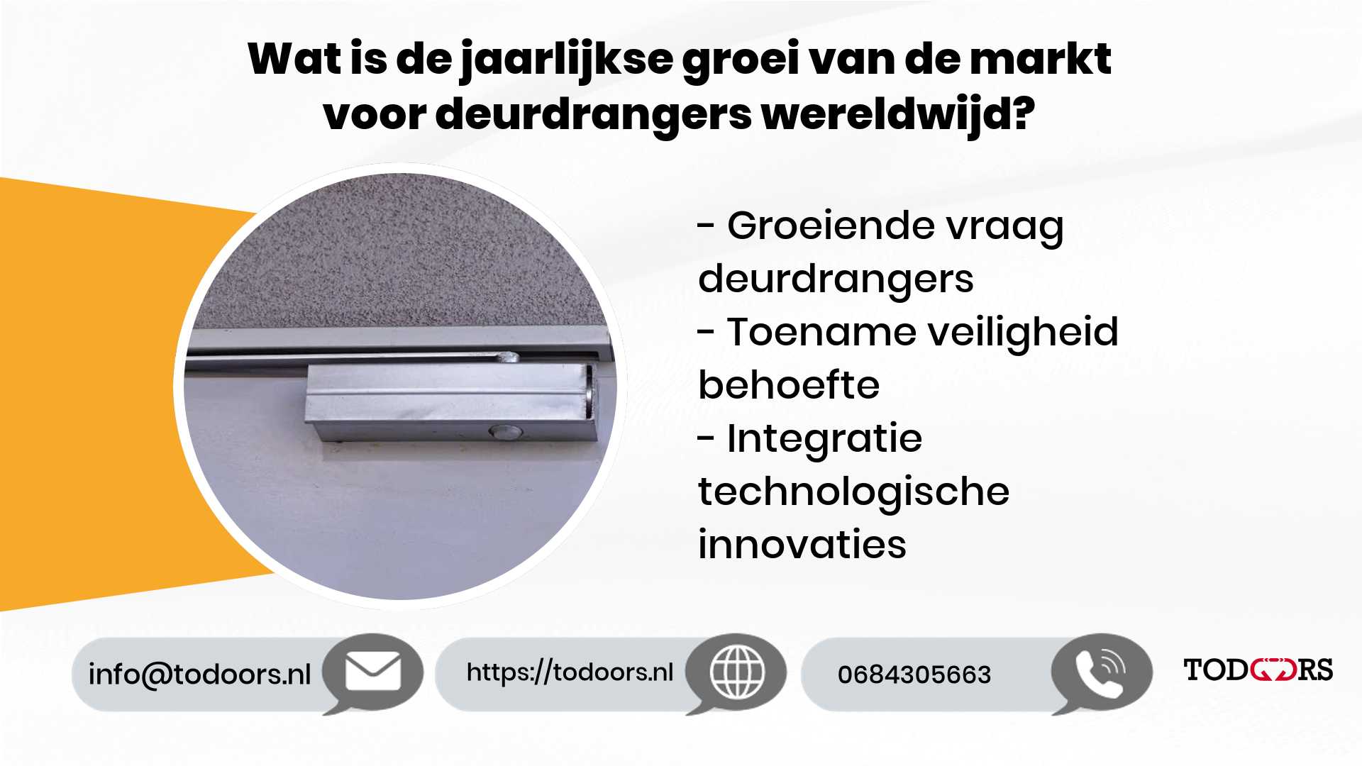 De voortdurende groei van de markt voor deurdrangers wordt gedreven door veiligheid, energiebesparing en technologische innovaties. Deze factoren dragen allemaal bij aan een stabiele groei van 4,5% per jaar. Wil je meer weten over hoe je jouw woning of kantoor nog veiliger en energie-efficiënt kunt maken? Contact via Live chat 24/7 en wij helpen je graag verder!