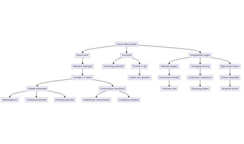 Het kiezen van een op maat gemaakte deur is een investering in de esthetiek en functionaliteit van je huis. Met een gemiddelde levertijd van 2 tot 4 weken kun je binnenkort genieten van jouw unieke deur. En denk eraan, een goede communicatie met leveranciers kan ervoor zorgen dat je goed geïnformeerd blijft.