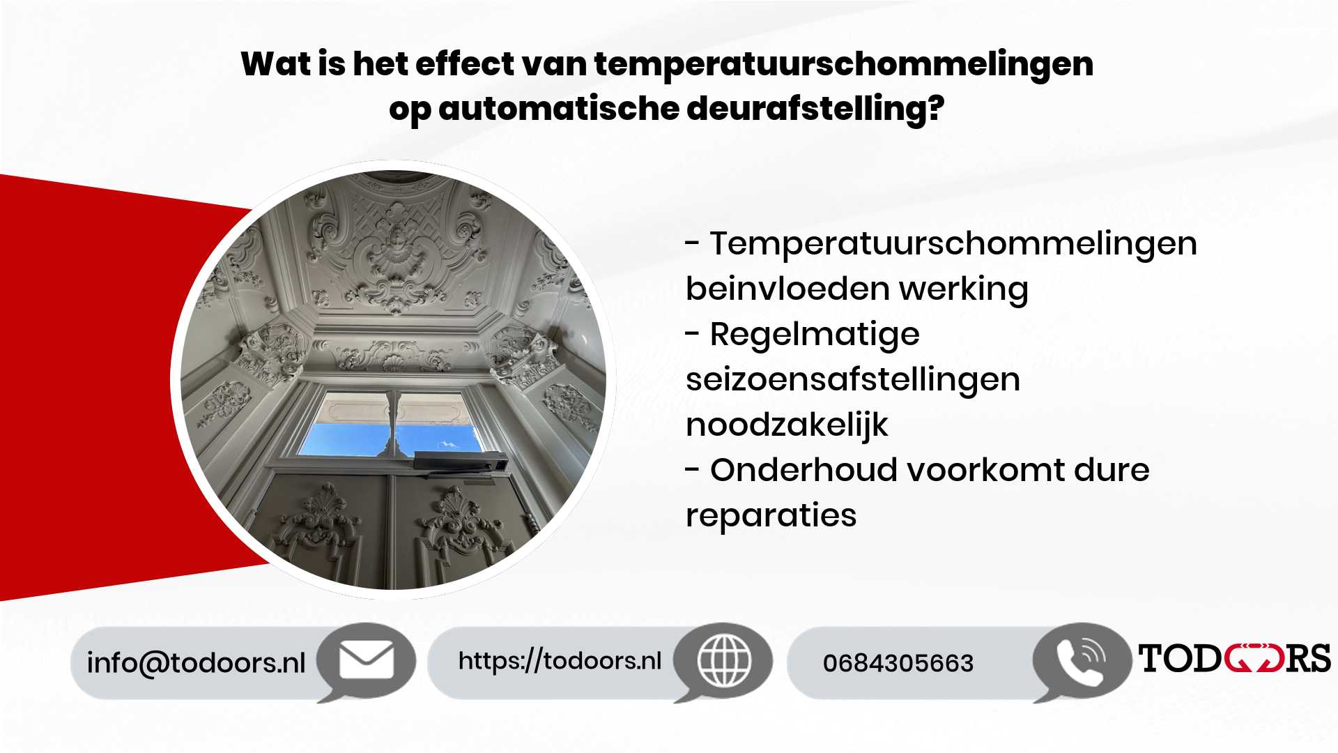 Temperatuurschommelingen hebben aanzienlijke effecten op automatische deuren. Door aandacht te besteden aan seizoensafstelling en onderhoud, kun je ervoor zorgen dat je deur altijd soepel en veilig functioneert. Als je vragen hebt of hulp nodig hebt met je automatische deuren, neem dan gerust contact met ons op via Live chat 24/7.