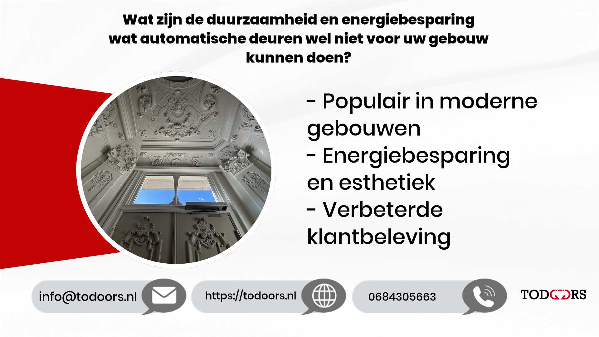 Automatische deuren zijn meer dan alleen een moderne toevoeging aan uw gebouw. Ze bieden duurzame voordelen, energiebesparing en zorgen voor een verbeterde klantervaring. Als u meer wilt weten over hoe deze deuren uw gebouw kunnen transformeren, aarzel dan niet om contact met ons op te nemen!