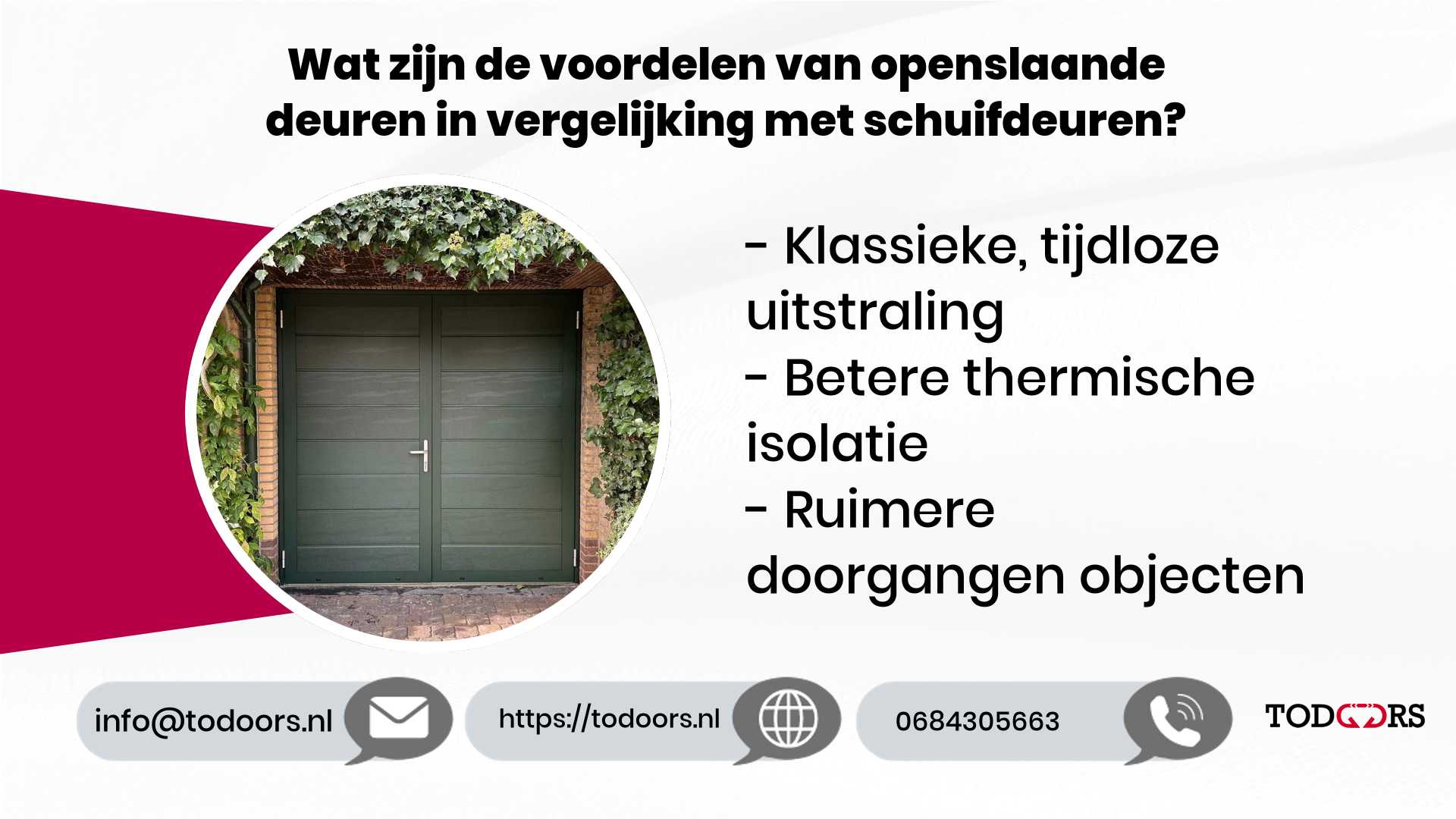 Openslaande deuren kunnen net zo veilig zijn als schuifdeuren, vooral wanneer ze zijn uitgerust met moderne sloten en beveiligingsmechanismen. Bekijk deze pagina over elektronische deurbeslagen voor meer informatie.