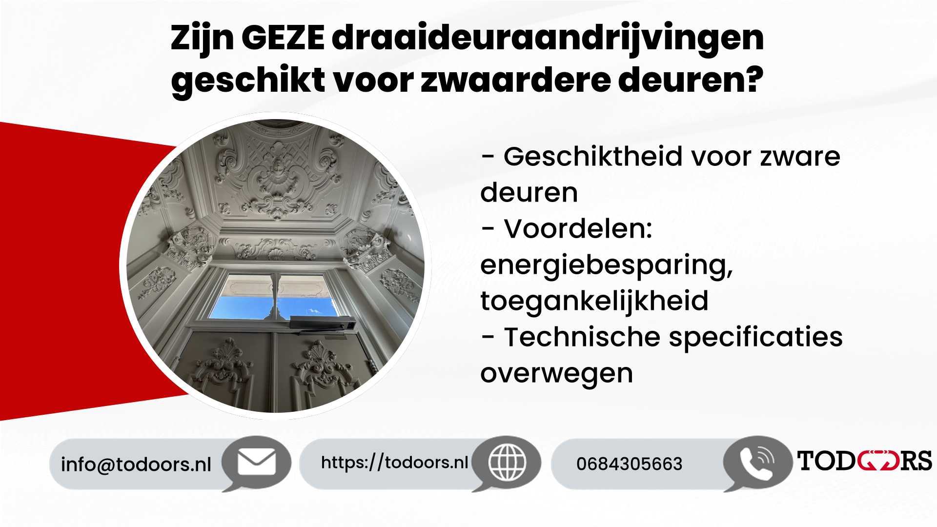 GEZE is een gerenommeerd merk als het gaat om automatische doorsystemen, waaronder draaideuraandrijvingen. Deze systemen zijn ontworpen om de toegang tot gebouwen gemakkelijker en efficiënter te maken. Maar het belangrijkste: zijn ze ook geschikt voor die zwaardere deuren?